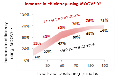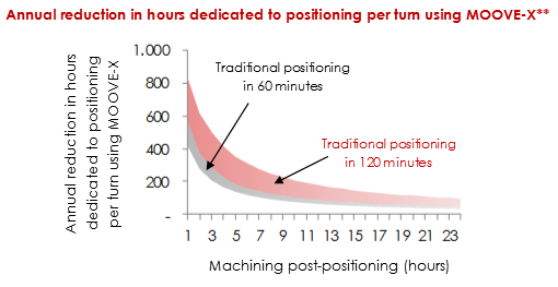 The impact of MOOVE-X on positioning activities related to mechanical machining is difficult to be assessed. It depends on different drivers such as: complexity and length of positioning, geometrical deformation of the single part, total time of machining and total cost of the working machine.Before be available on the market, the system was used on machines in effective production. Relating to the time of positioning recorded using traditional position systems, the MOOVE-X reduced the time for positioning between 69% and 79% in the case of traditional positioning of 2 hours and 30 minutes and between 43% and 27% in the case of traditional positioning of 30 minutes. In addition, depending on the time of positioning and the length of machining activities, it showed a reduction in total hours for positioning activities around 240 hours per turn.